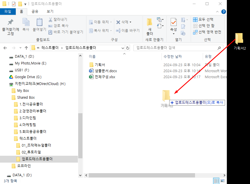 업로드할 폴더를 DirectCloud 폴더로 드래그 앤 드롭합니다.