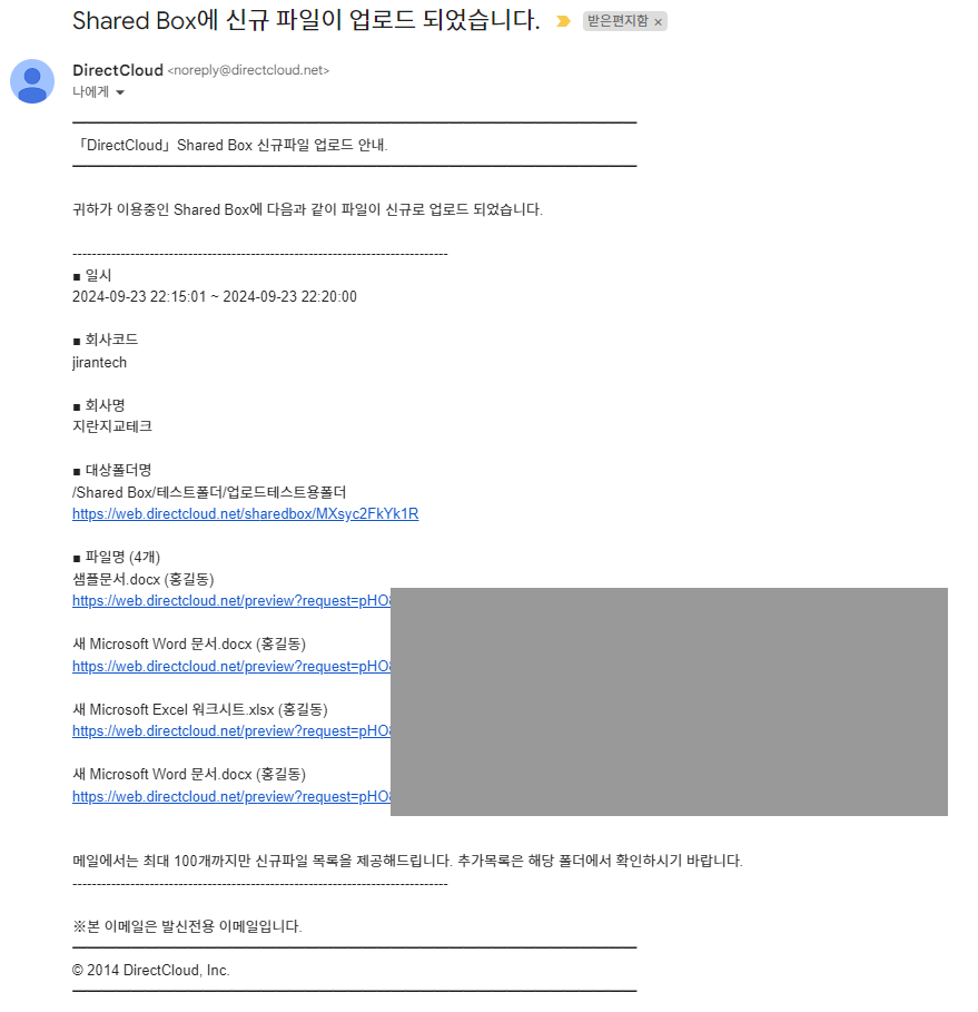 아래의 조건을 충족한 상태에서 폴더를 업로드하면 "업로더"의 공유자권한이 부여된 사용자 이외에도 "○○ 에 신규파일이 업로드 되었습니다."라는 제목의 알림 메일이 전송됩니다.