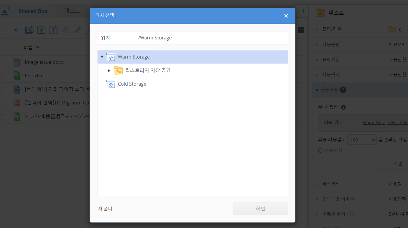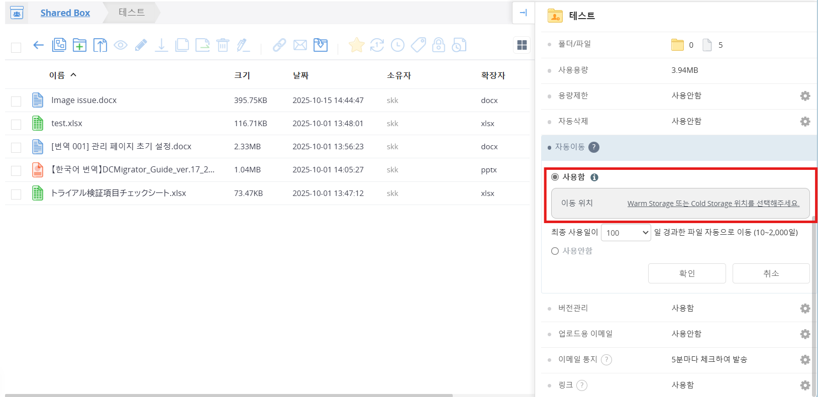 DirectCloud는 Shared Box에서 사용하는 스토리지(Hot Storage) 외에 'Warm Storage'를 제공합니다. 일반 Hot Storage에서 링크 및 버전 관리와 같은 일부 기능을 제외한 Warm Storage는 저렴한 가격으로 사용할 수 있습니다. 예를 들어, 자주 사용하지 않는 폴더의 데이터를 Warm Storage에 장기간 저장하면 Shared Box의용량을 효과적으로 사용할 수 있습니다. 이 매뉴얼에서는 사용자 페이지에서 Shared Box의 폴더 속성을 표시하고 파일이 Warm Storage로 자동 이동되도록 설정하는 방법에 대해 설명합니다.
