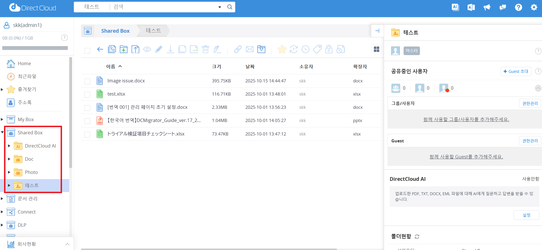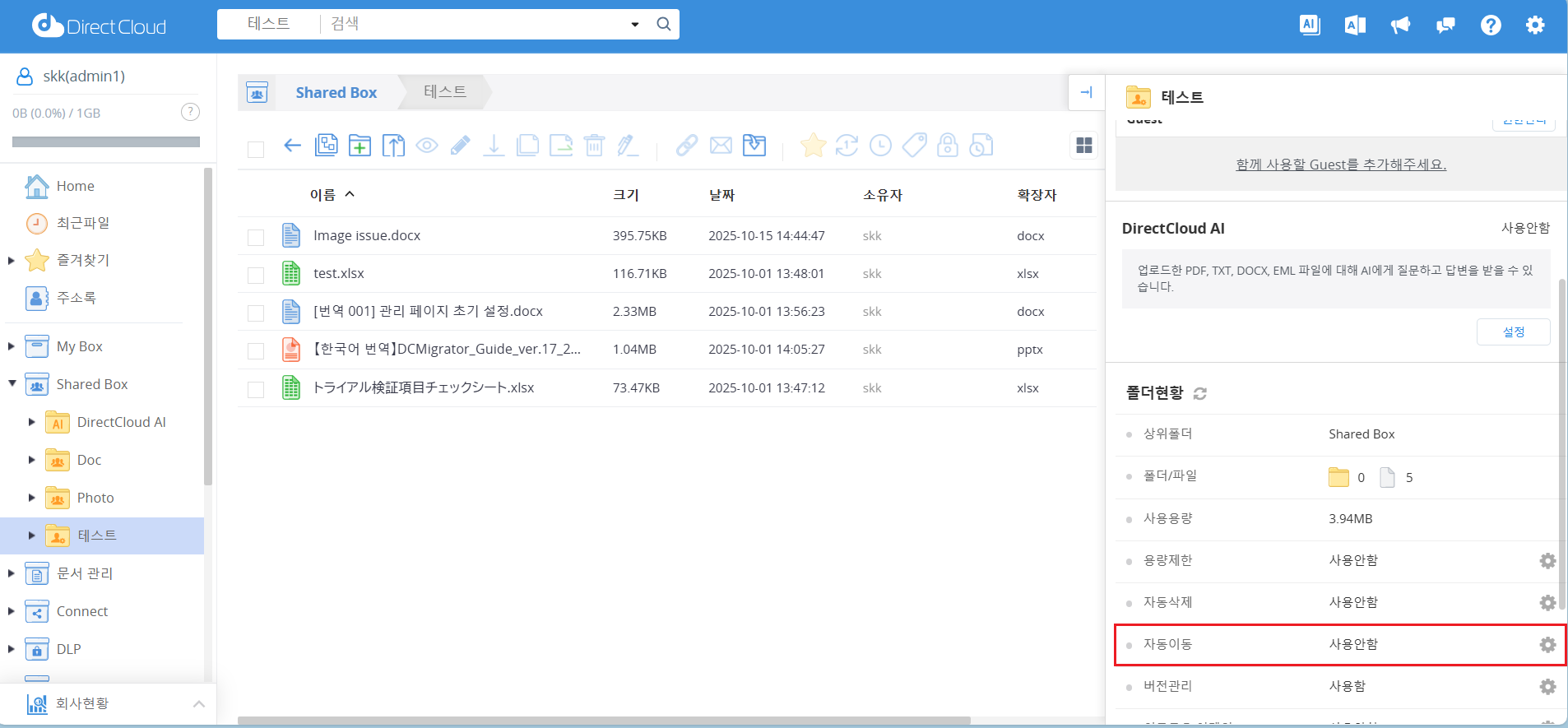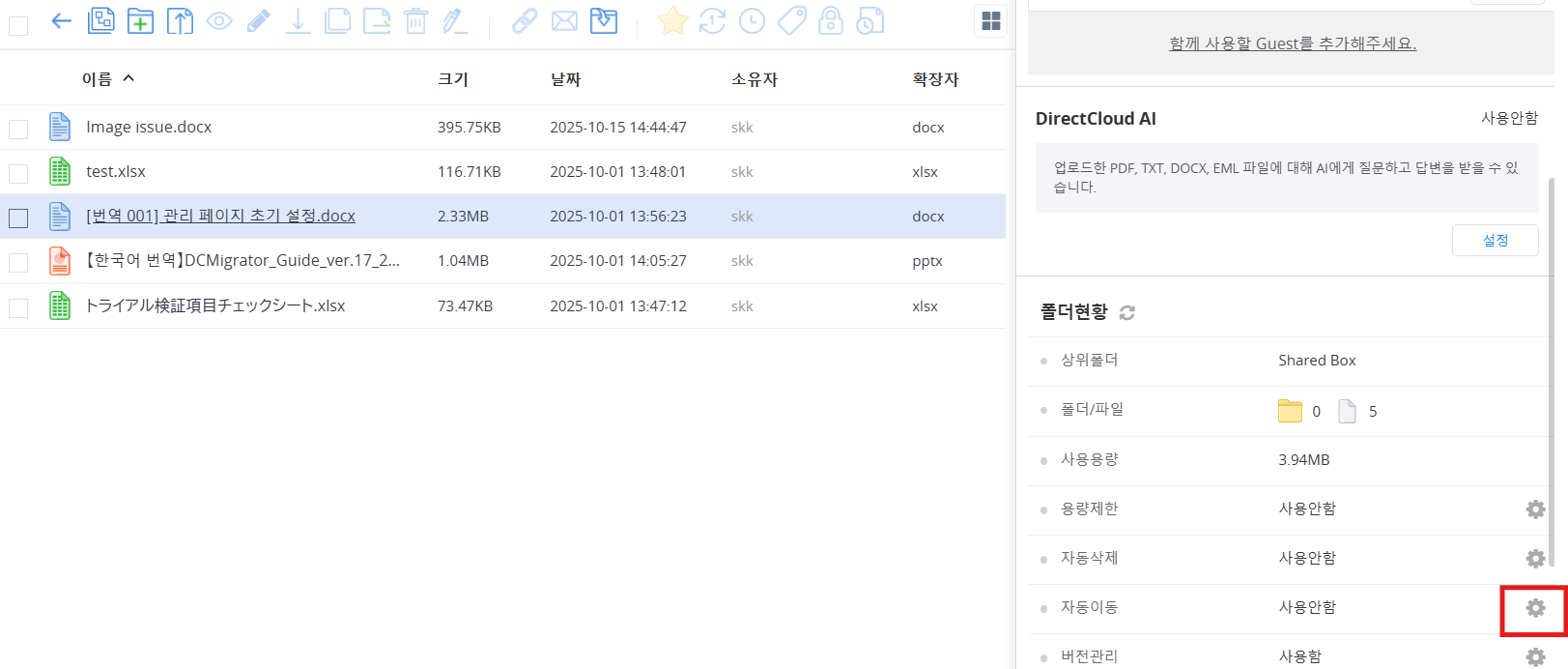 자동 이동으로 설정된 폴더 아래의 파일이 자동으로 이동되면 원래 폴더에 액세스할 수 있는 모든 사용자에게 "[DirectCloud] Shared Box 자동이동 안내"라는 제목의 이메일이 전송됩니다.