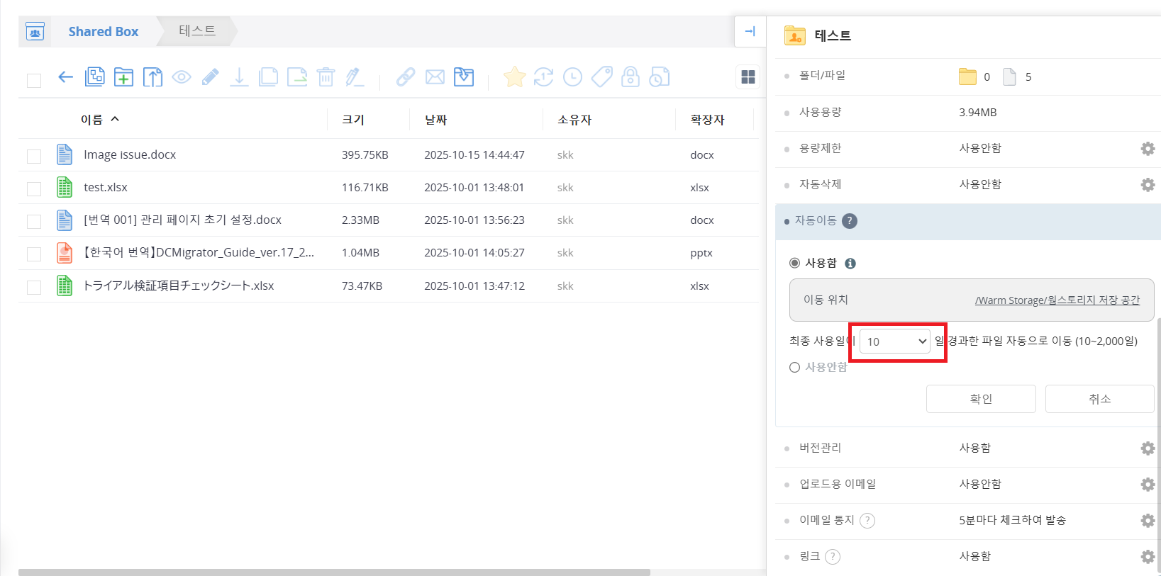 최종 파일 사용 날짜가 파일 자동 이동의 기준이 됩니다. 최종 파일 사용 날짜의 다음 날을 기산일로 하여, 기산일을 포함해 본 문서의 절차에서 설정한 일수가 경과한 후, 자정 0시부터 순차적으로 파일이 자동 이동됩니다.