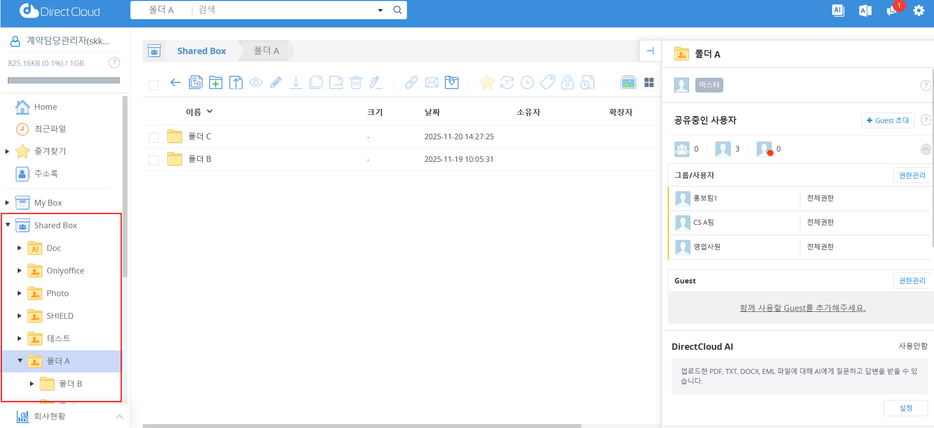 관리자가 DirectCloud AI를 사용으로 설정한 경우, 폴더 속성에 DirectCloud AI 항목이 표시되며, 동시에 버전 관리와 DirectCloud-OCR 항목은 폴더 속성에서 사라집니다.