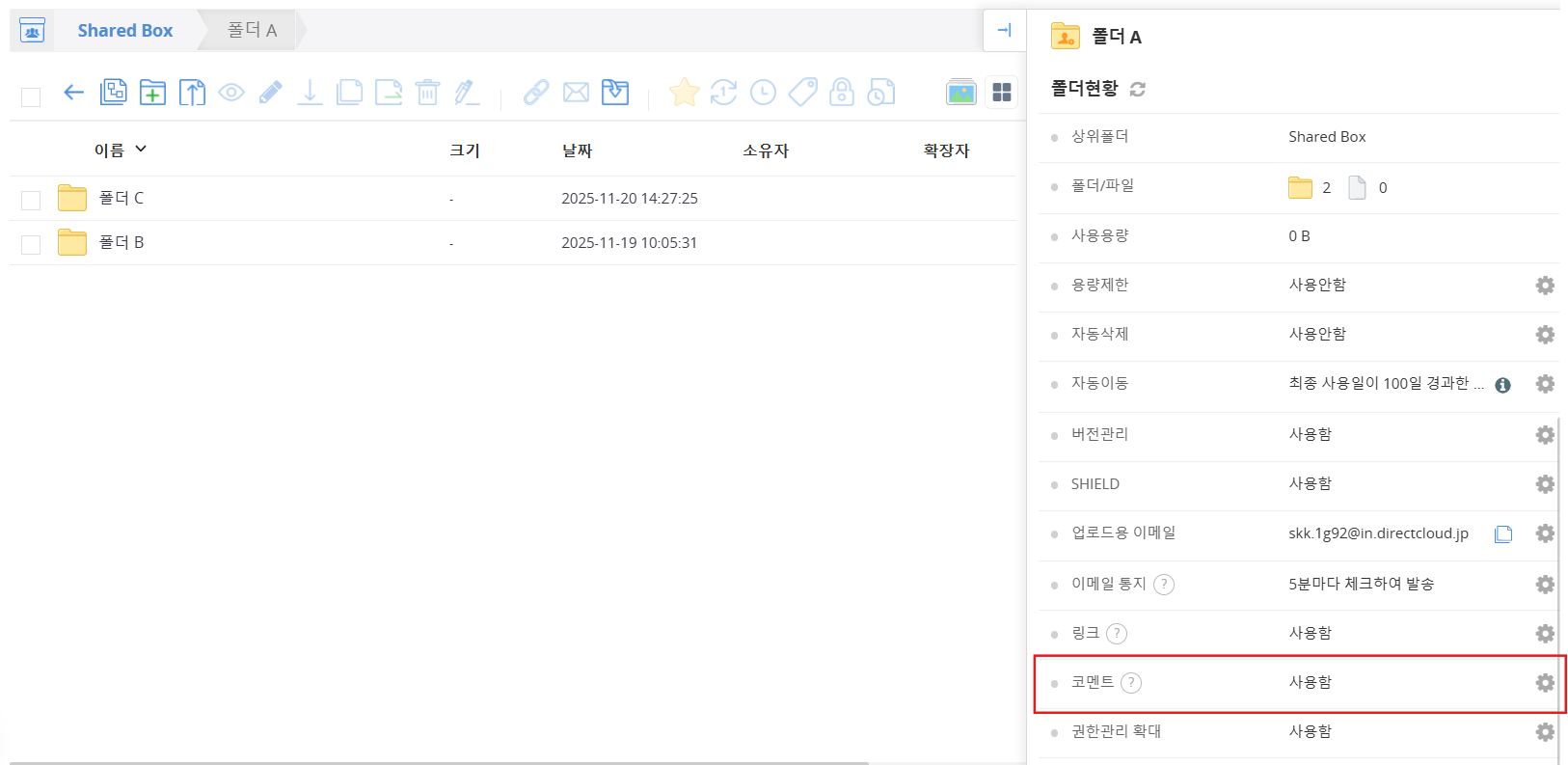 파일 코멘트 관련 폴더 속성은 Connect 폴더, DLP 폴더, 문서 관리 폴더에서도 설정할 수 있으며, 해당 기능의 사양과 제약 사항은 Shared Box와 동일합니다.