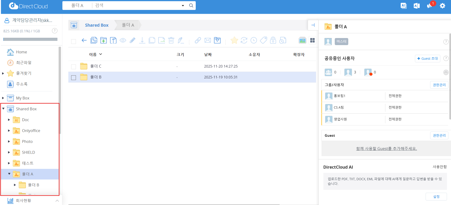 관리자에 의해 DirectCloud AI가 활성화되어 있는 경우, ‘폴더 속성’에 ‘DirectCloud AI’가 표시되며, 이때 ‘버전 관리’는 ‘폴더 속성’에서 표시되지 않습니다.