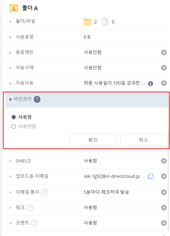 슬라이드 화면의 폴더 속성 설정에서 버전 관리에 '사용함'이 표시되는지 확인합니다. '사용 안함'이 표시되면 오른쪽에 표시된 설정 버튼을 클릭합니다. 버전 관리 설정이 표시됩니다.