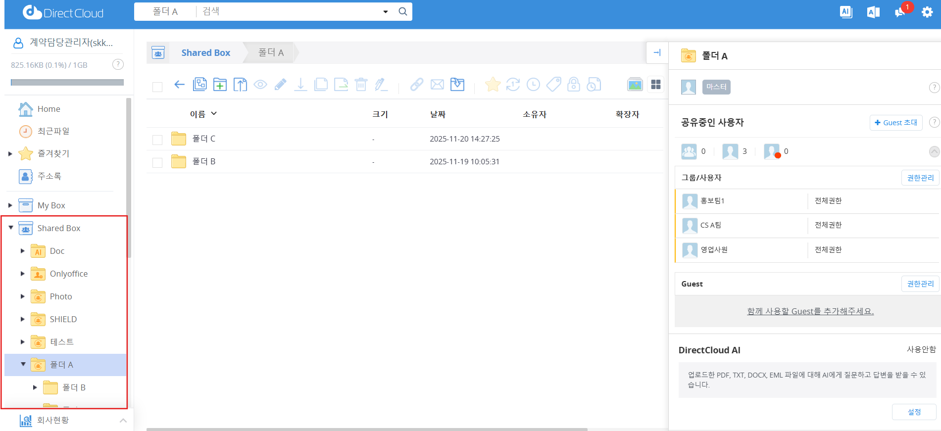 관리자가 DirectCloud AI를 사용으로 설정하면 폴더 속성에 DirectCloud AI가 표시되며, 동시에 버전 관리 항목은 폴더 속성에서 사라집니다.