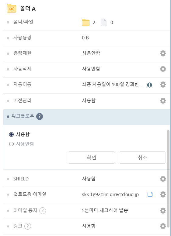 슬라이드 화면의 폴더 속성 설정에서 워크플로우에 '사용함'이 표시되는지 확인합니다. '사용 안함'이 표시되면 오른쪽에 표시된 설정 버튼을 클릭합니다. 워크플로우 설정이 표시됩니다.