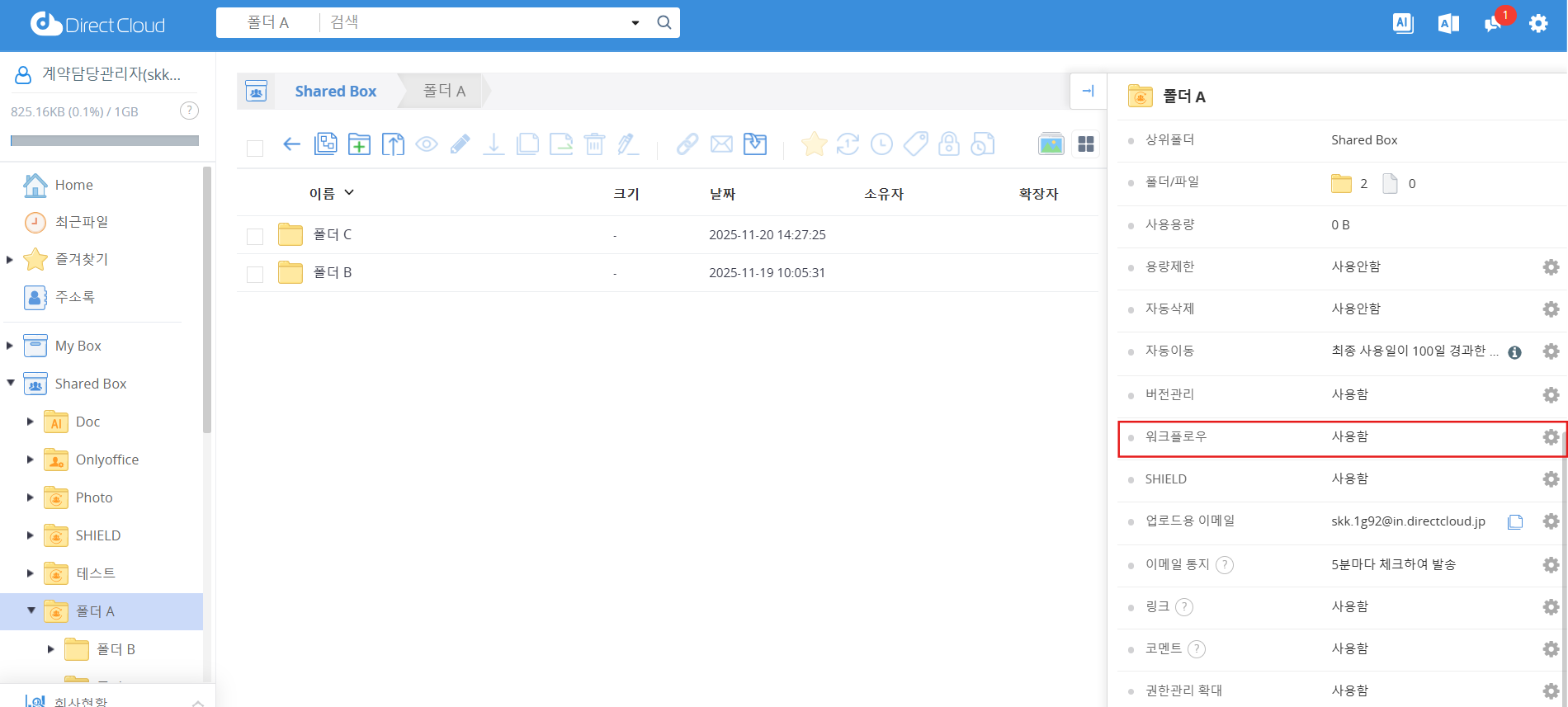 워크플로우는 첫 번째 계층의 폴더에 설정하며, 설정된 내용은 하위 폴더에 그대로 이어집니다.