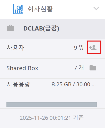 계약 담당 관리자로 사용자 페이지에 로그인하면, 등록된 사용자 수, 생성된 1단계 폴더 개수, 스토리지 사용 현황을 확인할 수 있습니다.