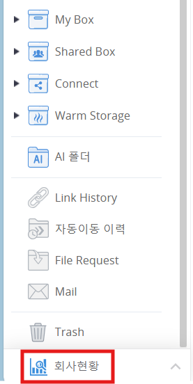· 관리 페이지 "공유설정" > "Shared Box " 메뉴에서 보여지는 Shared Box 하위에 생성된 첫 번째 계층 구조의 폴더 수가 표시됩니다. · Connect 폴더는 포함되지 않습니다. · 아이콘을 클릭하면 관리 페이지 상단으로 이동합니다.
