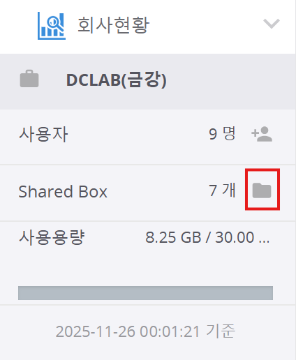 사용량 슬라이드 메뉴에서 Shared Box 오른쪽에 있는 아이콘을 클릭합니다.