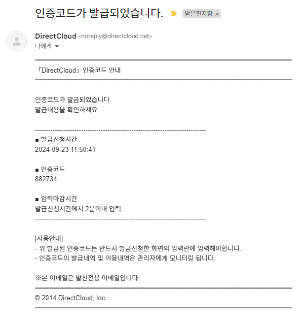 "이메일로 인증"을 클릭하면 사용자 정보에 등록된 이메일 주소로 알림 이메일을 받게 됩니다.