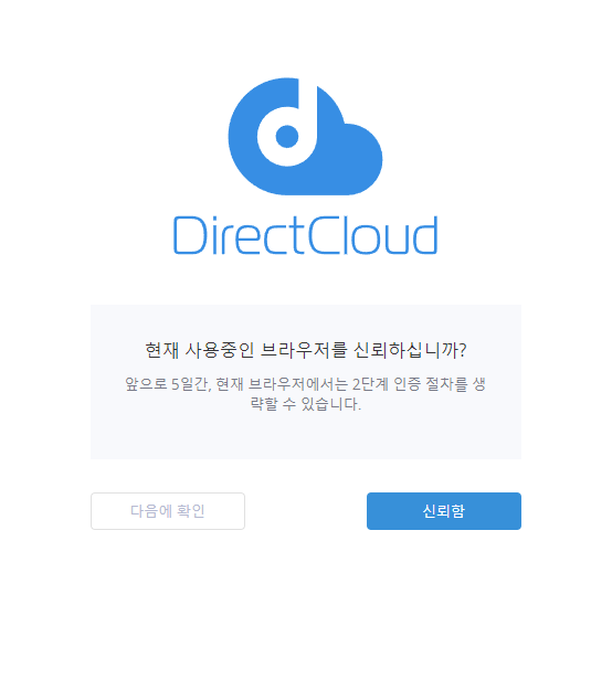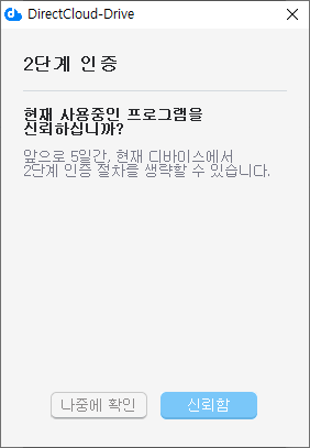 DirectCloud 드라이브 프로그램을 신뢰하는 프로그램으로 저장하여, 5일간 현재 기기에서 2단계 인증 절차를 생략할 수 있습니다. 원하시는 경우 '신뢰함' 버튼을 클릭합니다.
