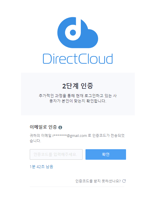 2단계 인증 화면이 표시되며 등록된 이메일로 전송된 인증코드를 입력하는 화면이 표시됩니다. 인증코드를 입력하고 확인 버튼을 클릭합니다.
