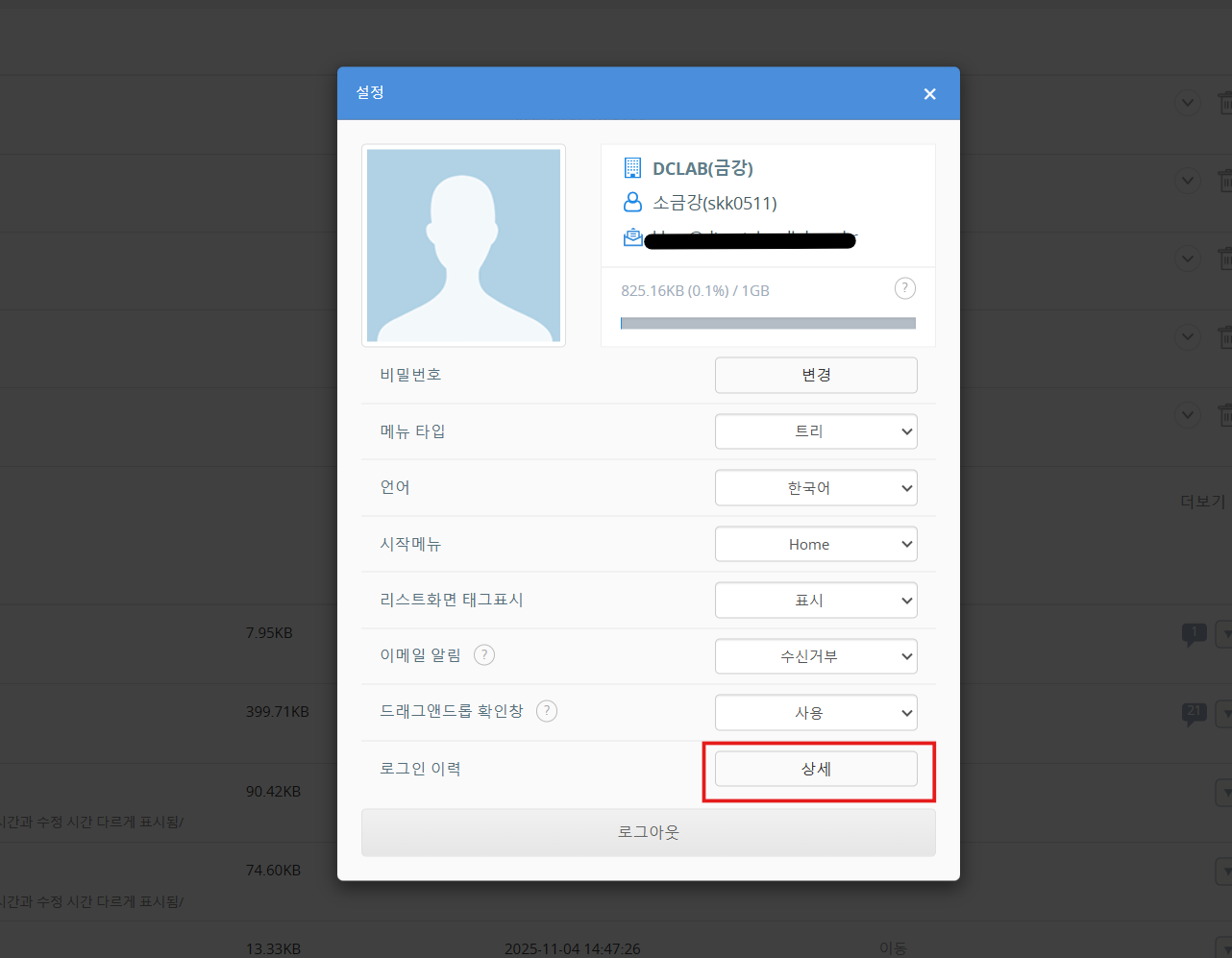 '로그인 이력'에서 '상세' 버튼을 클릭합니다.