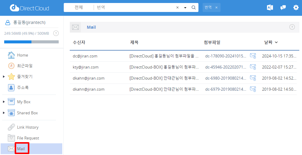 'Mail' 메뉴를 클릭합니다. 첨부파일 메일발송의 내역이 목록으로 표시됩니다.