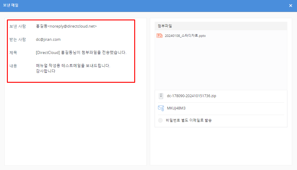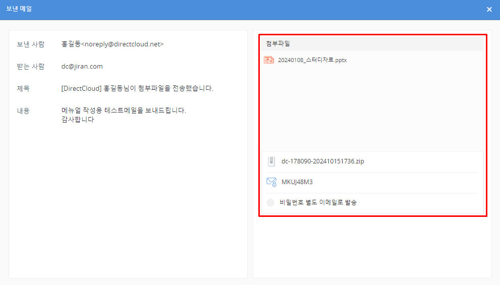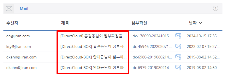 본인 외의 사용자가 파일첨부 메일발송을 이용한 내역은 확인할 수 없습니다.