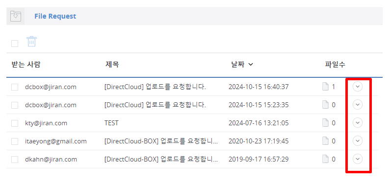 업로드 요청의 내역은 기본적으로 날짜와 시간의 내림차순으로 표시됩니다. 헤더의 수신인, 제목, 날짜와 시간을 클릭하여 정렬할 수 있습니다. 단, 폴더와 파일 목록과는 달리 마지막으로 정렬한 설정이 저장되지 않으므로 Web 브라우저를 다시 실행하면 기본 상태로 돌아갑니다. 정렬 방법은 폴더와 파일 목록을 정렬하는 절차와 동일합니다. 자세한 내용은 [Web] 폴더 및 파일 목록을 정렬하는 방법을 참조해주시기 바랍니다.