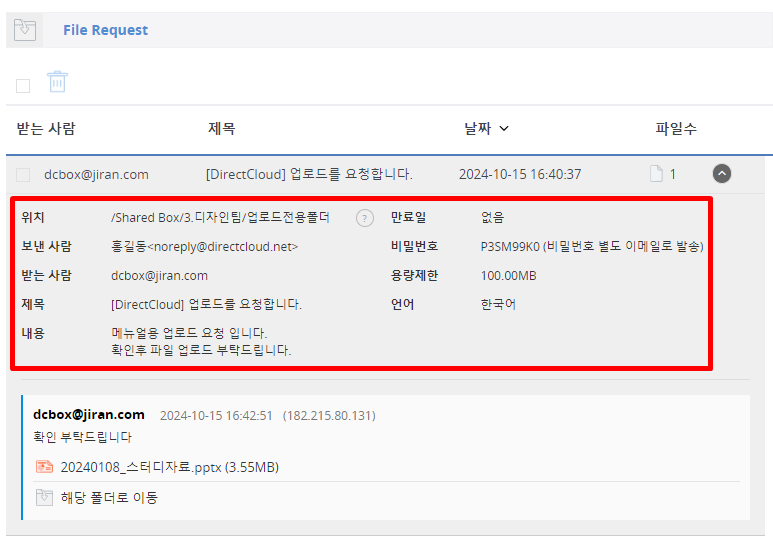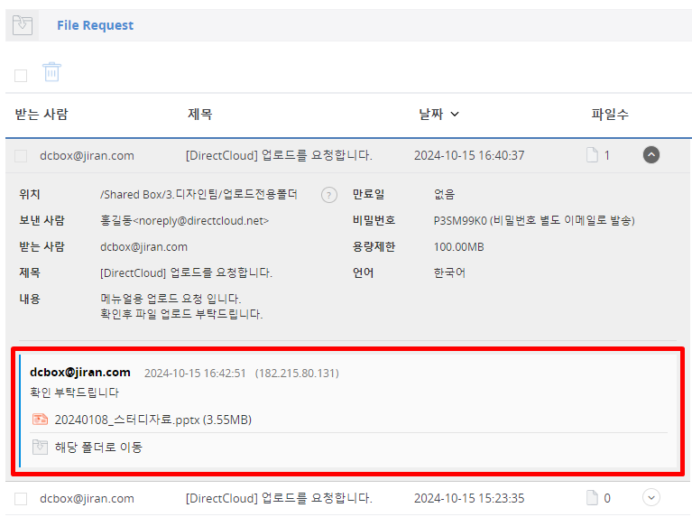 수신 폴더의 수신 화면에 업로드된 파일이 있는 경우 대상 이메일 주소, 업로드된 파일 이름, 업로드된 시간 및 IP 주소 및 메시지가 표시됩니다. 받은 폴더로 이동을 클릭하면 업로드된 파일이 저장된 폴더로 이동합니다.