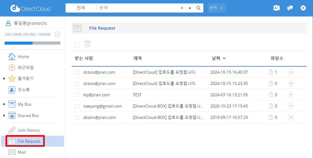 'File Request' 메뉴를 클릭합니다. 업로드 요청의 내역이 나열됩니다.