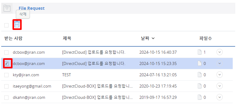 업로드 요청 내역 메뉴에서 삭제하려는 업로드 요청 내역을 체크한 뒤 휴지통 아이콘을 클릭합니다.