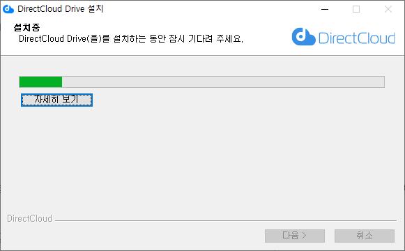 DirectCloud Drive 설정 화면에서 시작하려면 '업데이트' 버튼을 클릭합니다. 업데이트 준비 화면이 표시되면 설치가 자동으로 시작되고 DirectCloud Drive 설정 화면에 설치 진행률이 표시됩니다.