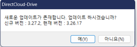 업데이트 알림 대화 상자 DirectCloud 드라이브를 시작하면 "새 버전이 있는데 업데이트하시겠습니까?" 라는 메시지가 표시됩니다. 알림 대화 상자에는 현재 버전 및 최신 버전 정보가 표시됩니다. 최신 버전의 DirectCloud Drive로 업데이트하면 이 대화 상자가 더 이상 표시되지 않습니다. "예" 버튼을 클릭하여 업데이트를 시작합니다.