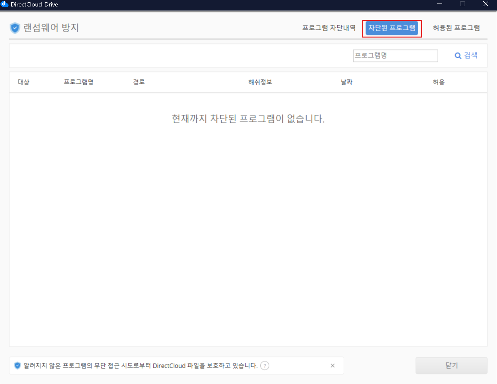 랜섬웨어 대책으로 차단되는 대상은 DirectCloud 드라이브에 저장된 파일을 변경한 프로그램만 해당됩니다. 프로그램에 의해 파일이 편집된 경우에만 차단되며, 파일을 열기만 한 경우에는 변경으로 판단되지 않습니다.