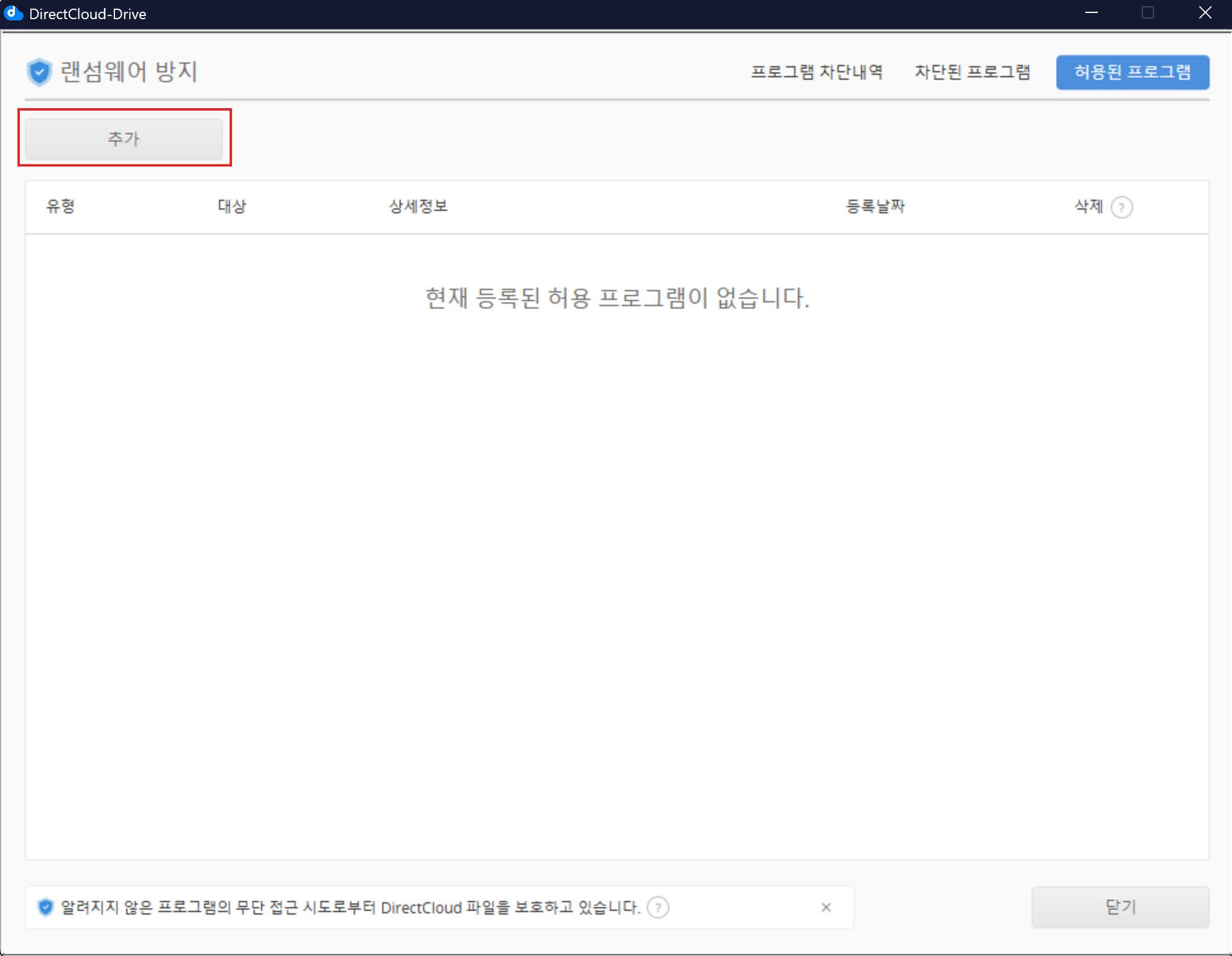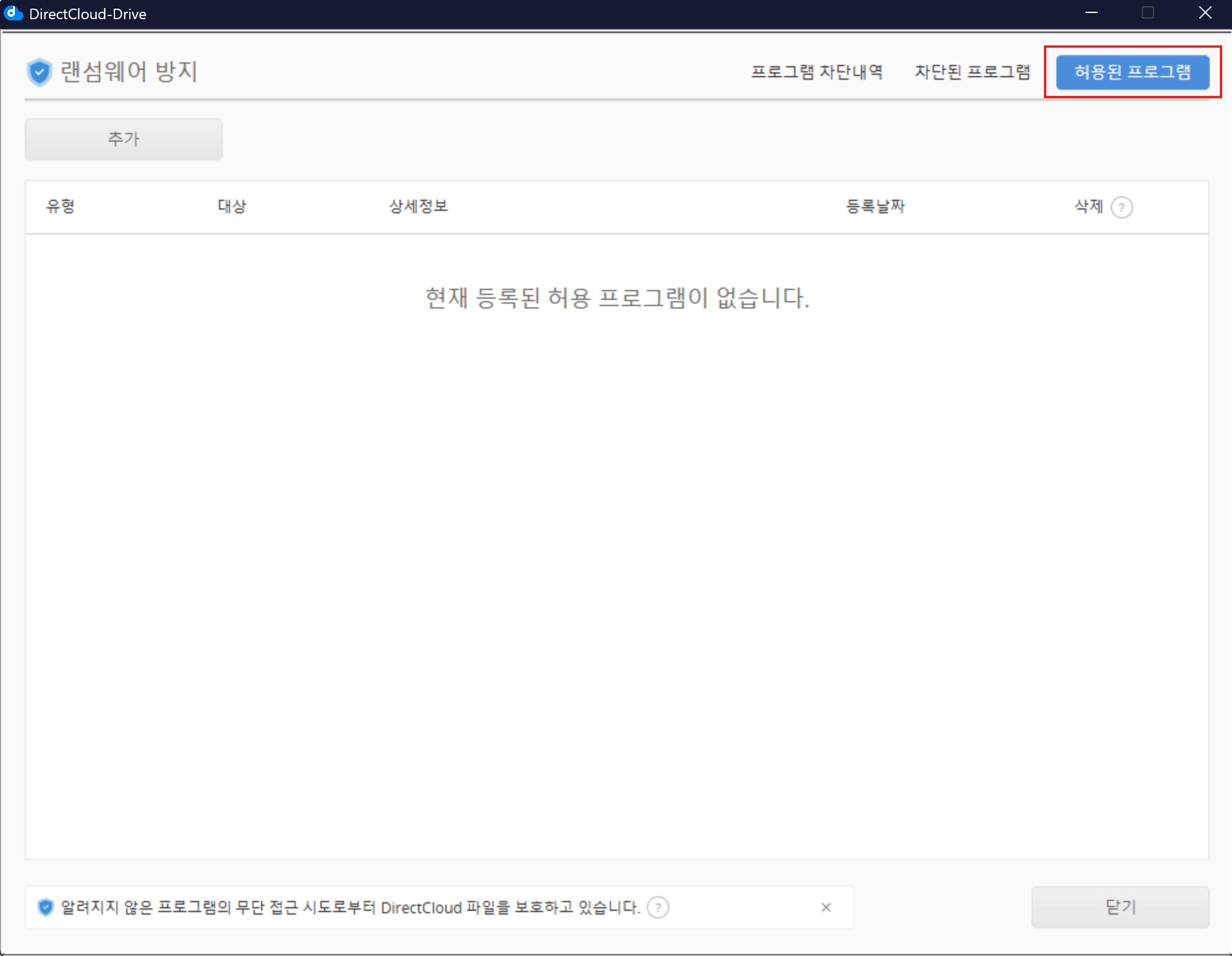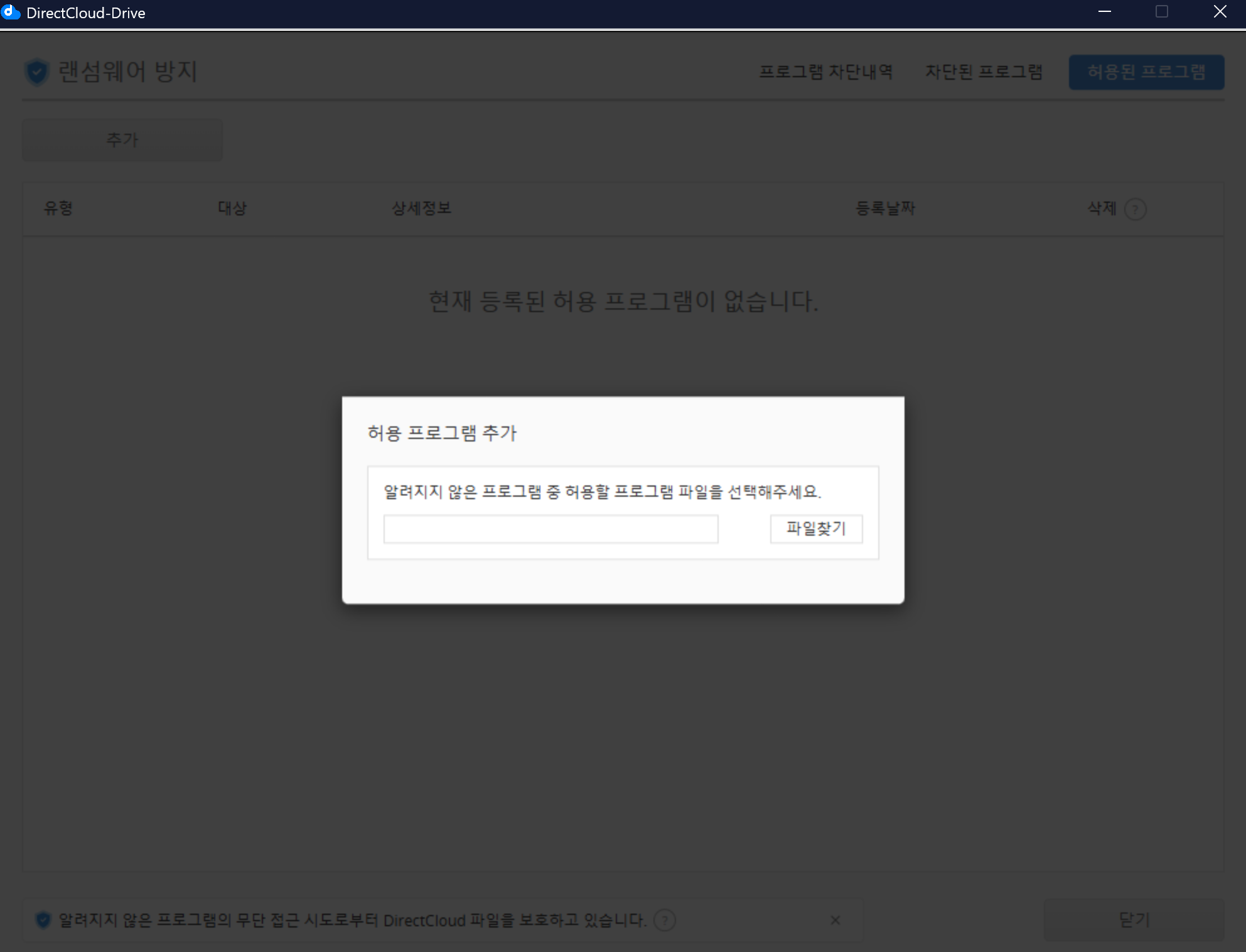 DirectCloud 드라이브에서 허용 프로그램을 등록/제거하는 방법