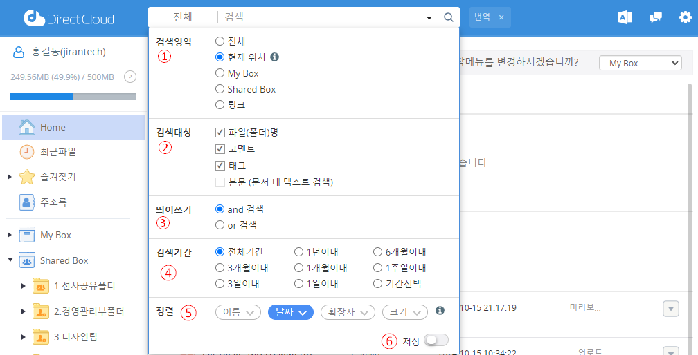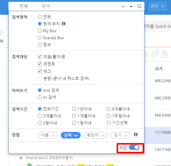검색 기준 설정 내용을 유지하려는 경우 설정한 검색 조건은 DirectCloud에서 로그아웃할 때 재설정됩니다. 이 설정을 로그아웃해도 유지되도록 하려면 검색 조건 설정 창에서 오른쪽 하단에 표시되는 '저장' 토글 버튼을 켭니다.