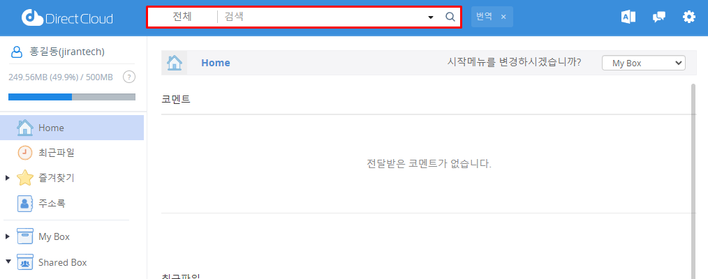 DirectCloud Drive에서는 계약 플랜이나 계약 옵션에 관계없이 ‘검색 범위’와 ‘검색 대상’을 지정하여 검색할 수 없습니다.