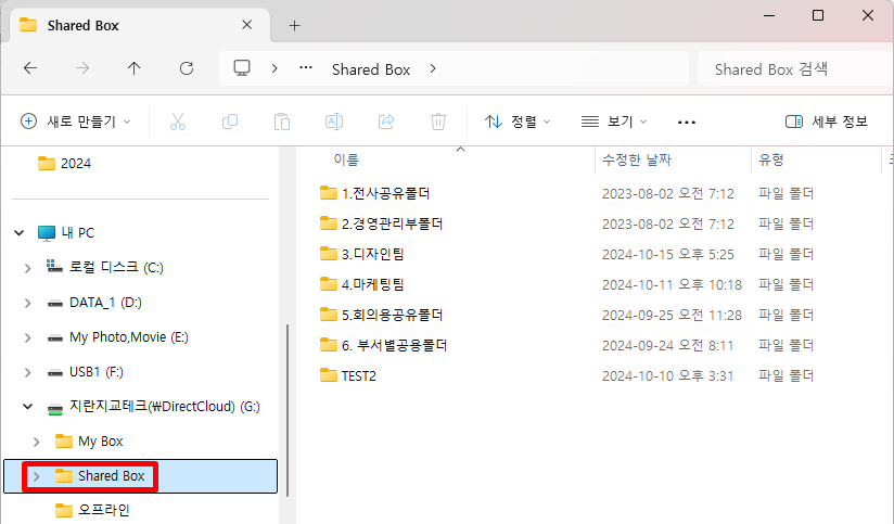 Windows 탐색기에서 DirectCloud 드라이브의 My Box또는 Shared Box 아래 폴더를 선택합니다.
