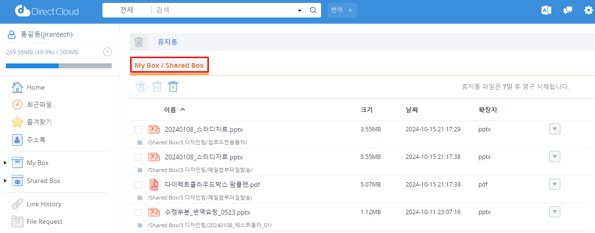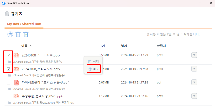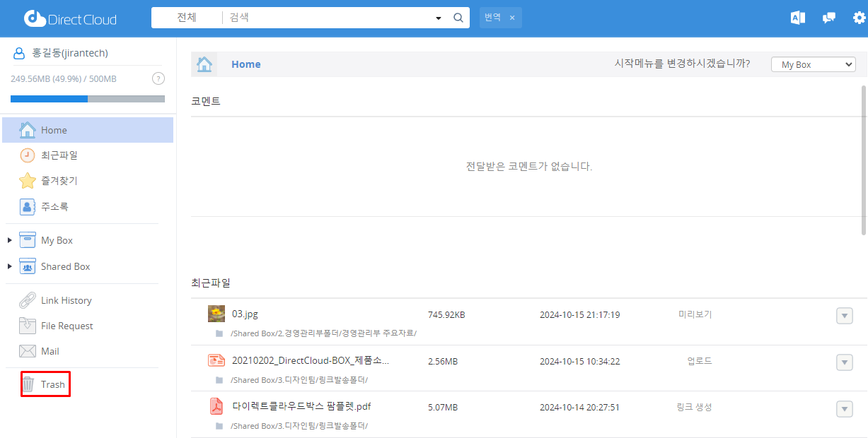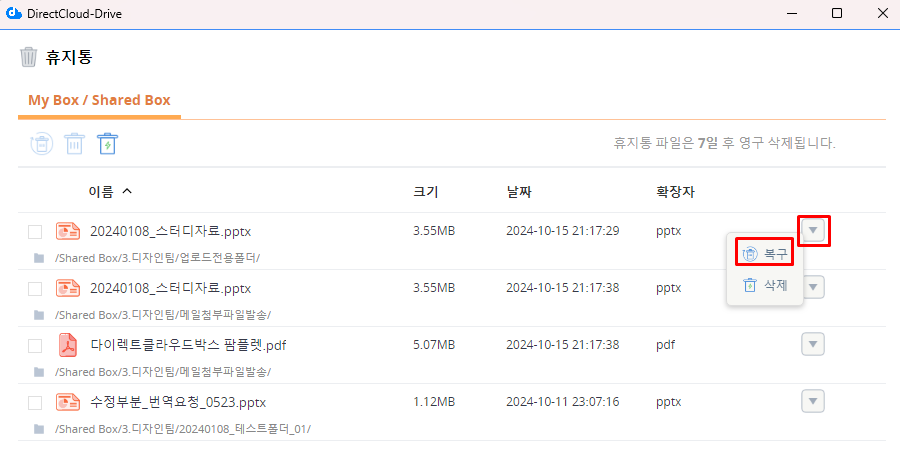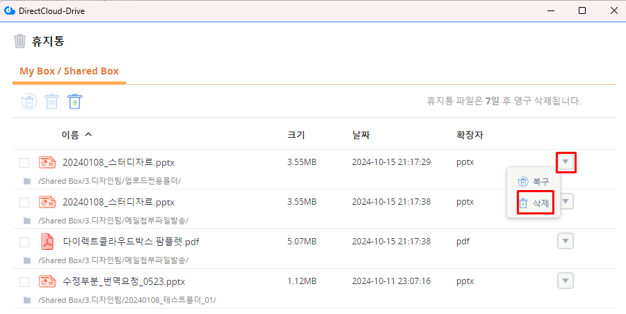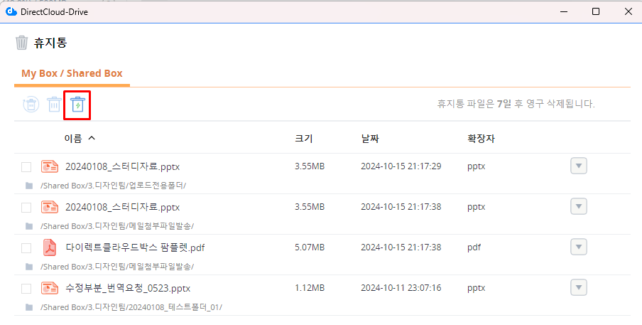 DirectCloud 드라이브에서 휴지통 폴더 또는 파일 확인