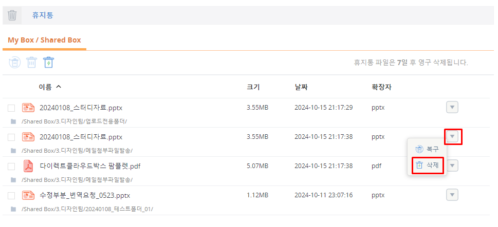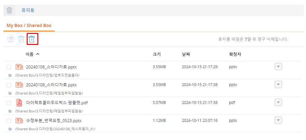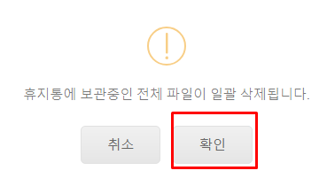 휴지통의 각 탭에 저장된 폴더와 파일을 한 번에 삭제할 수 있습니다. 삭제한 휴지통 폴더나 파일은 회사사 휴지통으로 이동합니다.