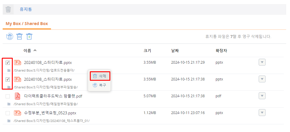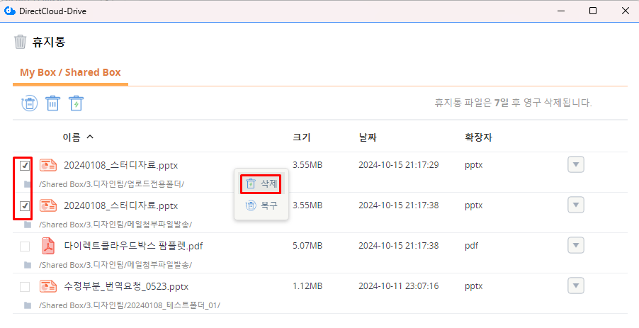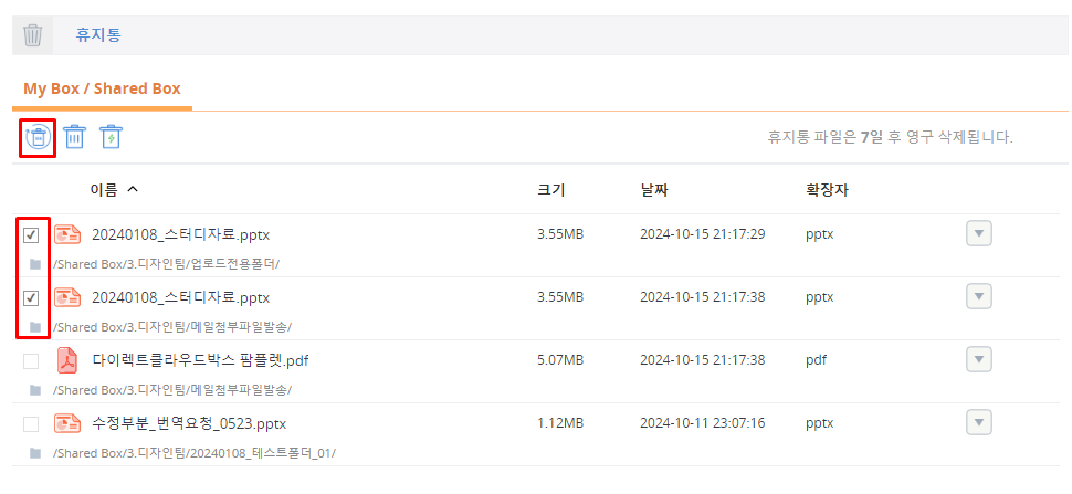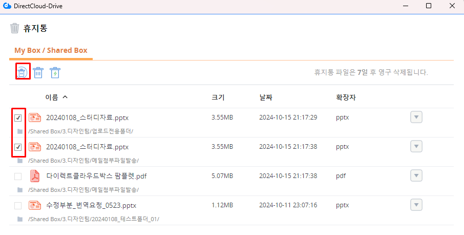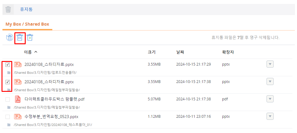 My Box와 Shared Box의 휴지통인 [My Box/Shared Box] 탭이 선택된 상태로 휴지통이 표시됩니다.