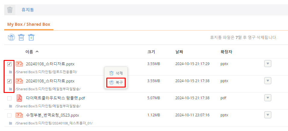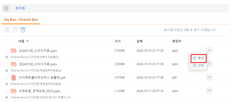 My Box에서 삭제된 파일을 복구하면, 하위 폴더가 비어 있더라도 폴더 경로가 자동 생성되어 파일이 복구됩니다. Shared Box, Connect 폴더, DLP 폴더, Warm Storage, Cold Storage에서 삭제된 파일을 복구할 때는 상황에 따라 동작이 달라집니다.