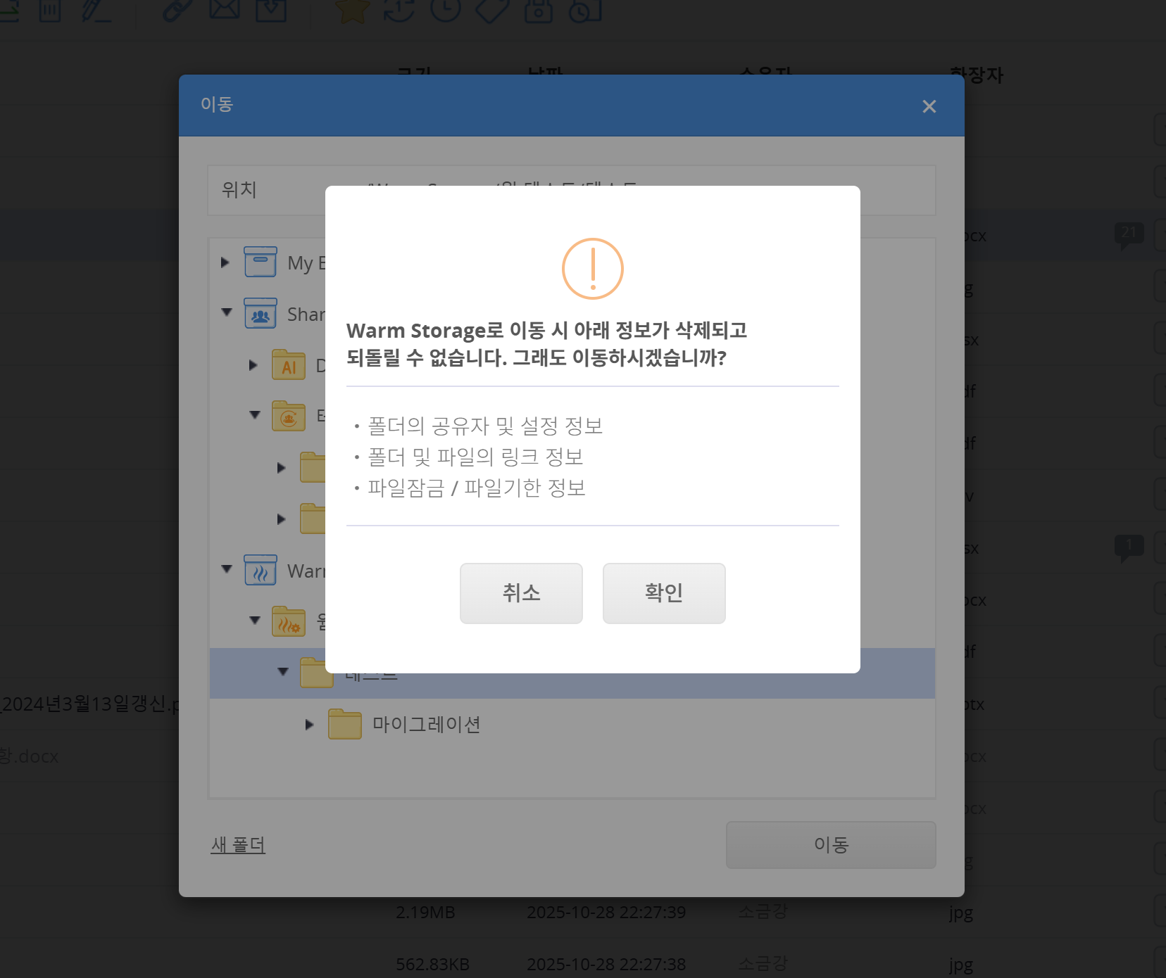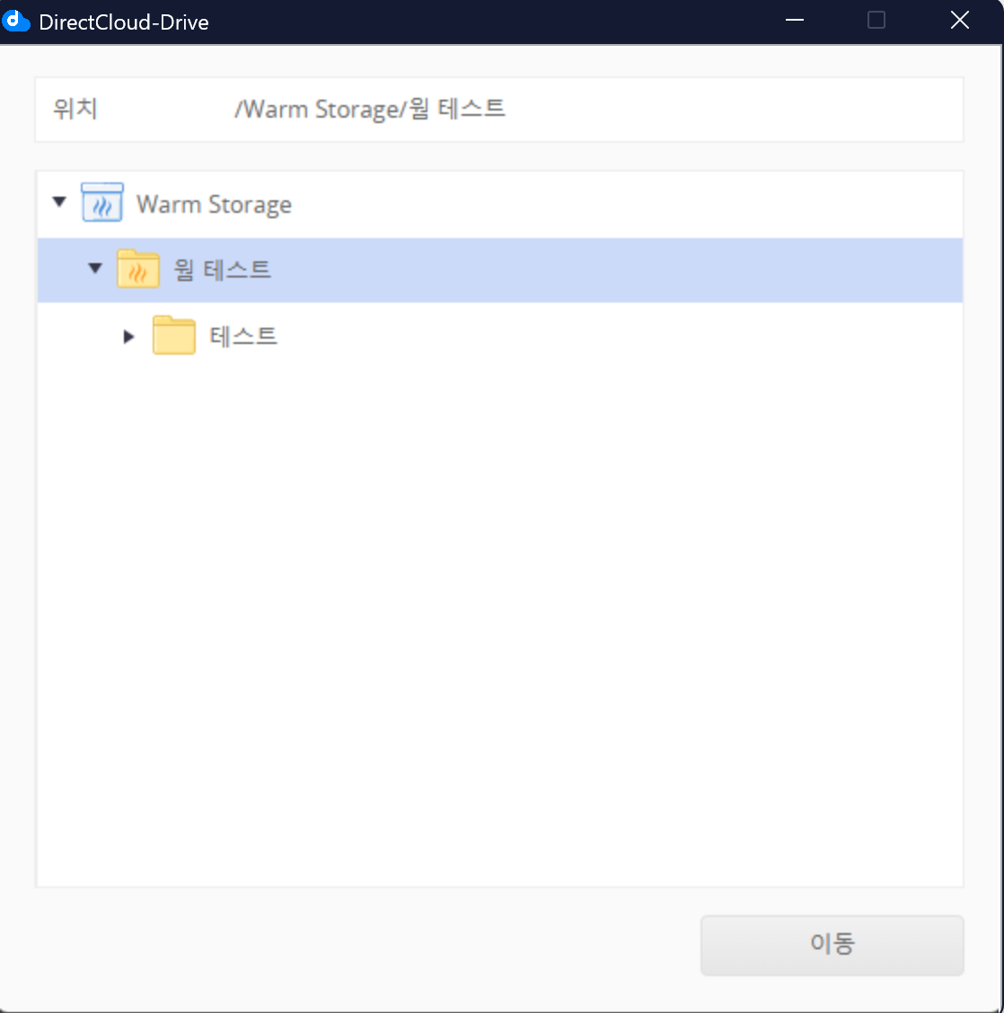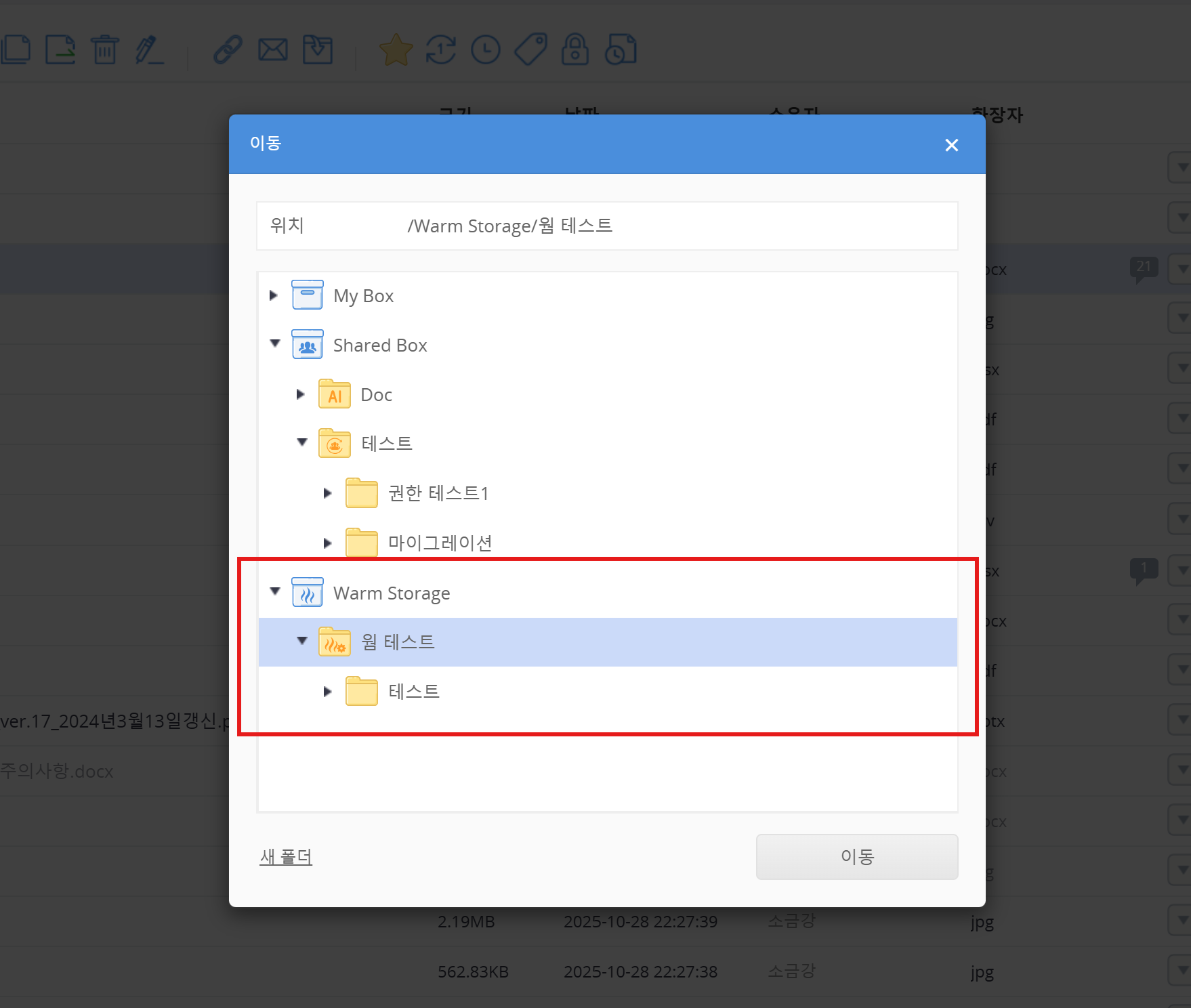 이동할 Warm Storage의 폴더를 선택하고 '이동' 버튼을 클릭합니다.