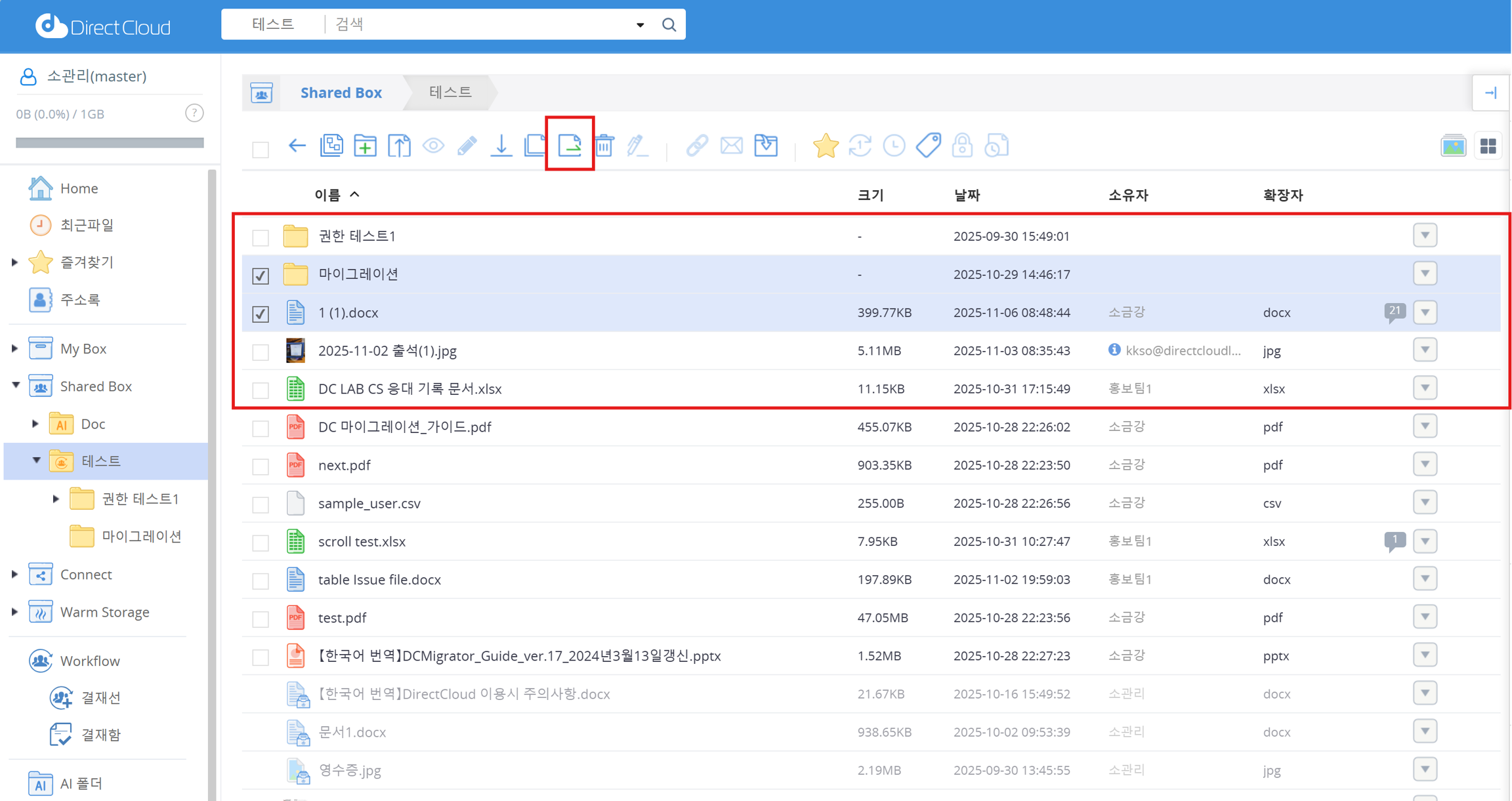 Shared Box 아래의 폴더에서 Warm Storage로 이동하려는 폴더 또는 파일에 체크하고 '이동' 버튼을 클릭합니다. 여러 개의 폴더와 파일을 동시에 선택할 수도 있습니다. 마우스 오른쪽 버튼을 클릭해 표시되는 메뉴나 오른쪽의 ▼ 버튼을 클릭해 나타나는 메뉴에서 '이동'을 선택할 수도 있습니다.
