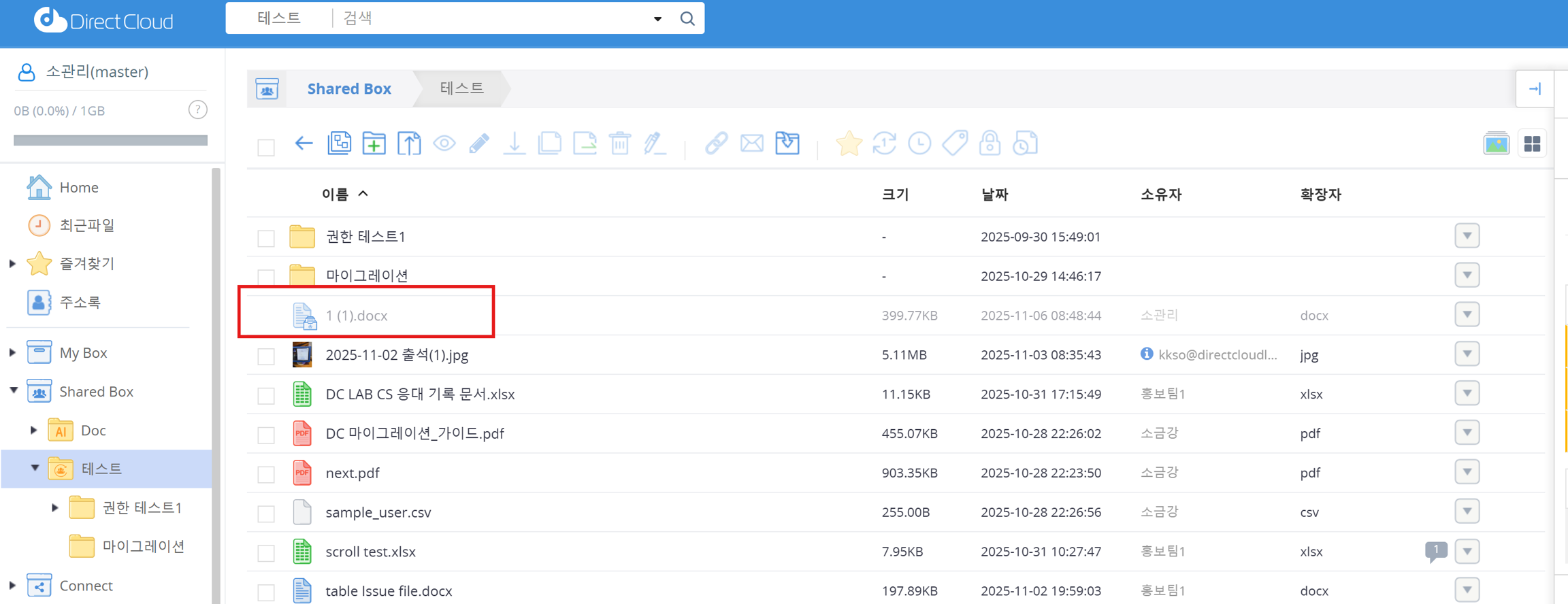 DirectCloud Drive의 경우, Shared Box에서 이동된 폴더나 파일에는 배지가 표시되지 않습니다. 이 매뉴얼에서는 Shared Box에서 이동된 폴더나 파일의 정보를 확인하는 방법에 대해 설명합니다.