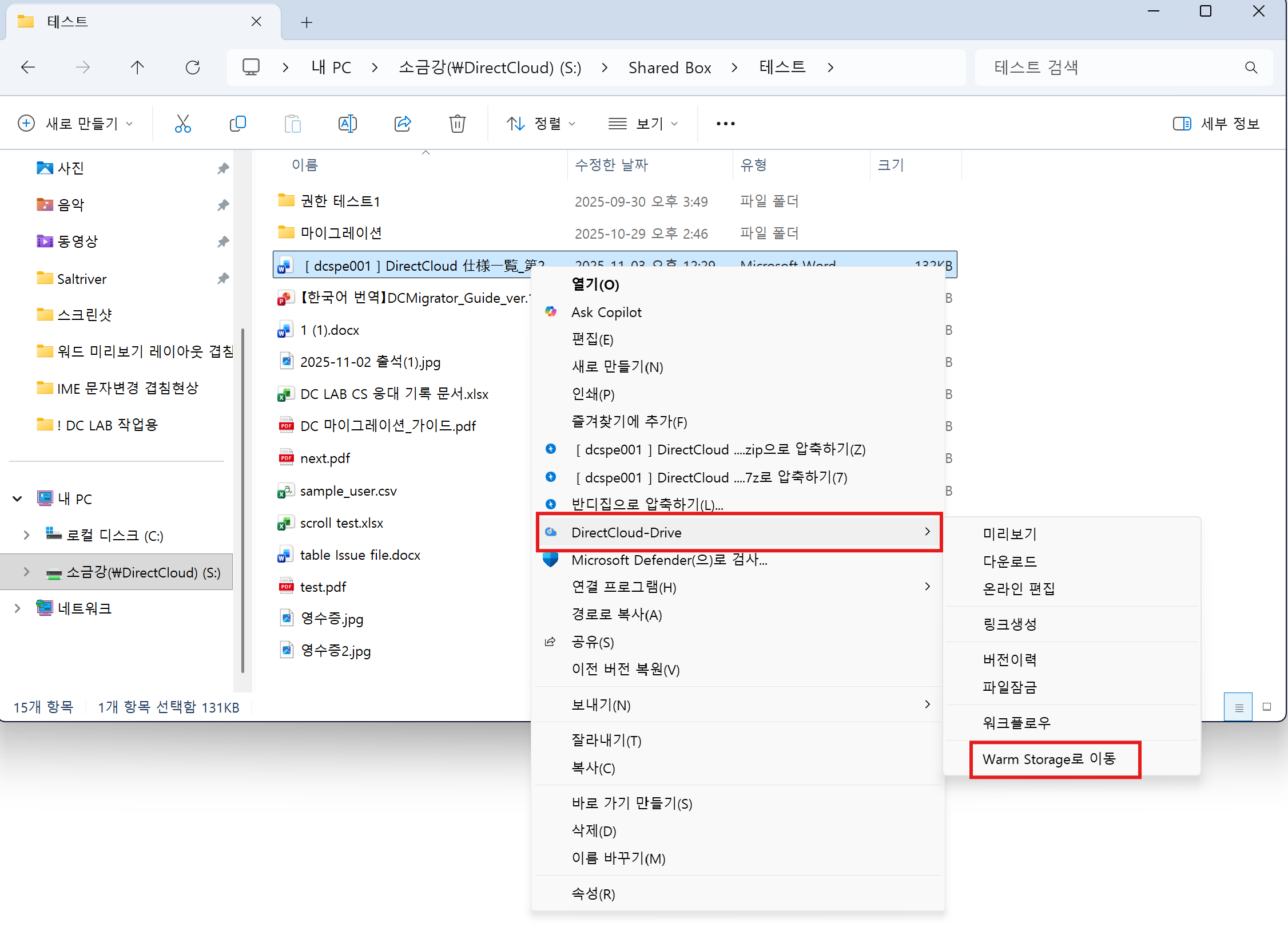 Shared Box 아래의 폴더에서 Warm Storage로 이동하려는 폴더 또는 파일을 마우스 오른쪽 버튼으로 클릭하고, 표시된 메뉴에서 ‘DirectCloud-Drive’ > ‘Warm Storage로 이동’을 클릭합니다. 여러 개의 폴더와 파일을 동시에 선택할 수도 있습니다.