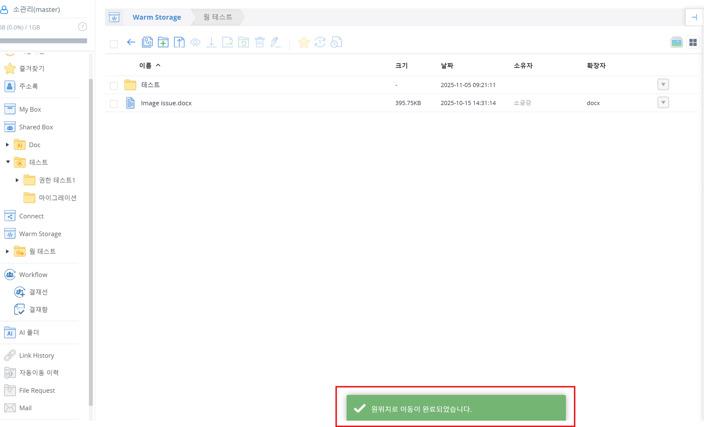 폴더 또는 파일이 Shared Box의 원래 폴더로 이동되며, ‘원래 위치로 이동이 완료되었습니다.’라는 메시지가 표시됩니다.