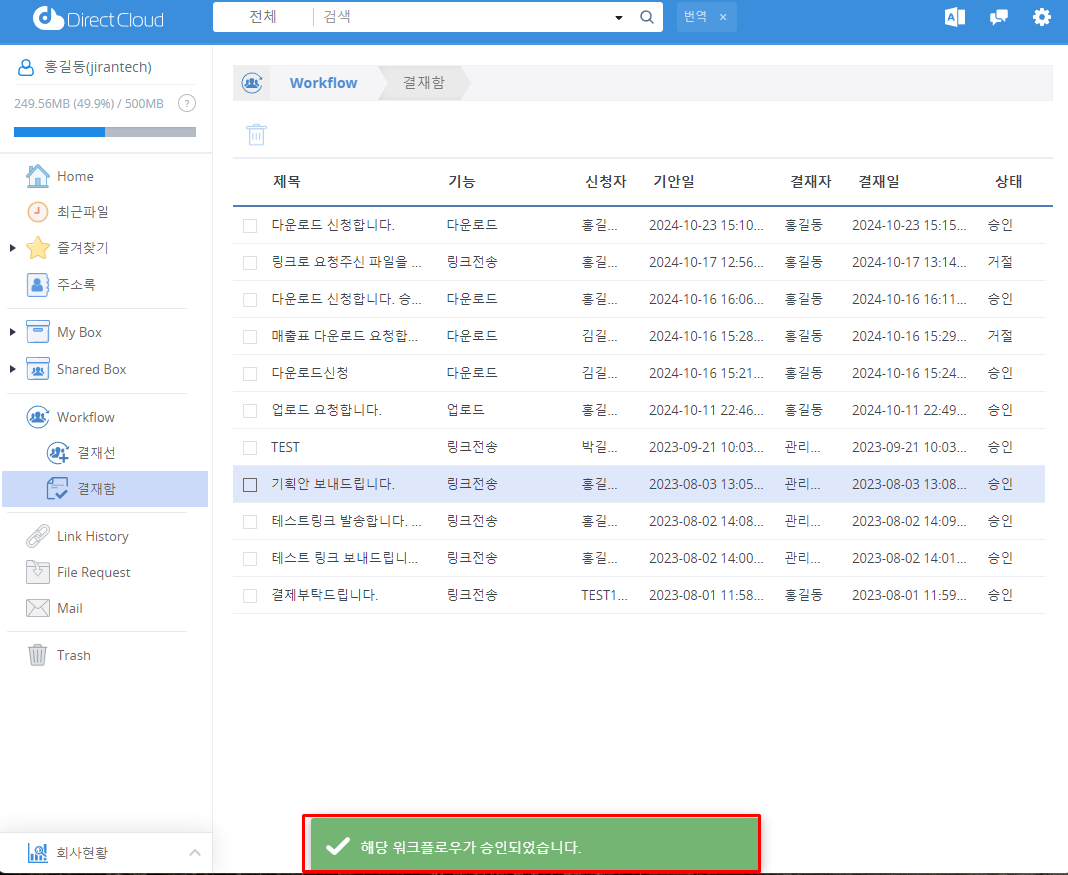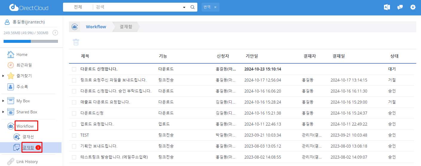 다운로드 워크플로우 결재자 또는 대리 결재자로 구성된 사용자로 DirectCloud 드라이브에 로그인합니다.