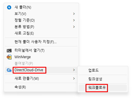 DirectCloud 드라이브의 Shared Box 등에서 마우스 오른쪽 버튼을 클릭한 뒤 나타나는 메뉴에서 'DirectCloud-Drive' > '워크플로우'를 클릭합니다.