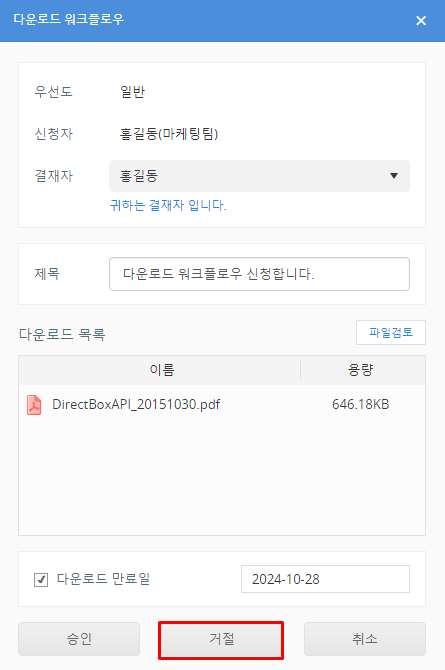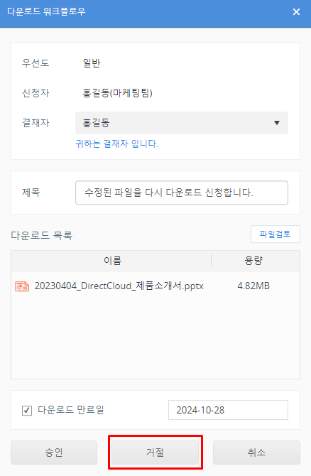 '다운로드 워크플로우' 화면에서 다운로드 신청 내용을 확인하고 '거절' 버튼을 클릭합니다.