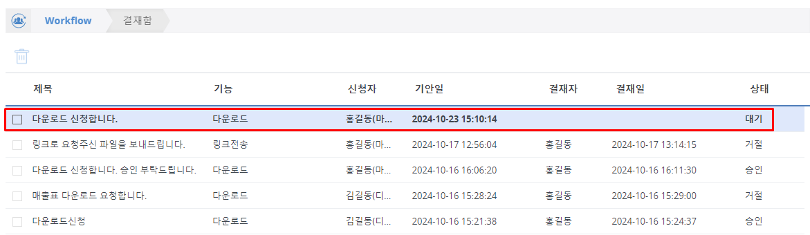 다운로드 워크플로우를 신청한 신청자가 표시됩니다.