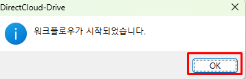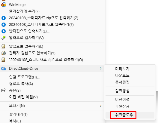 DirectCloud 드라이브의 Shared Box 폴더 등을 마우스 오른쪽 단추로 클릭하고 나타나는 메뉴에서 'DirectCloud -Drive' > '워크플로우'를 클릭합니다.