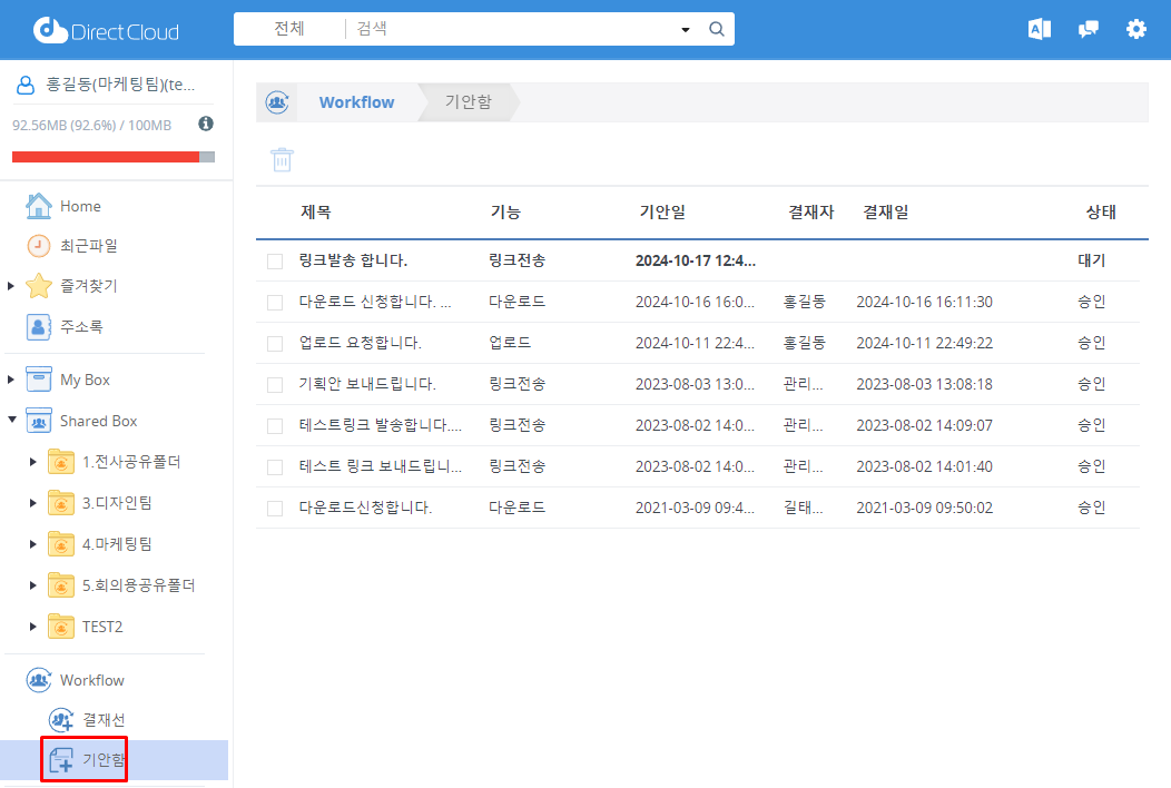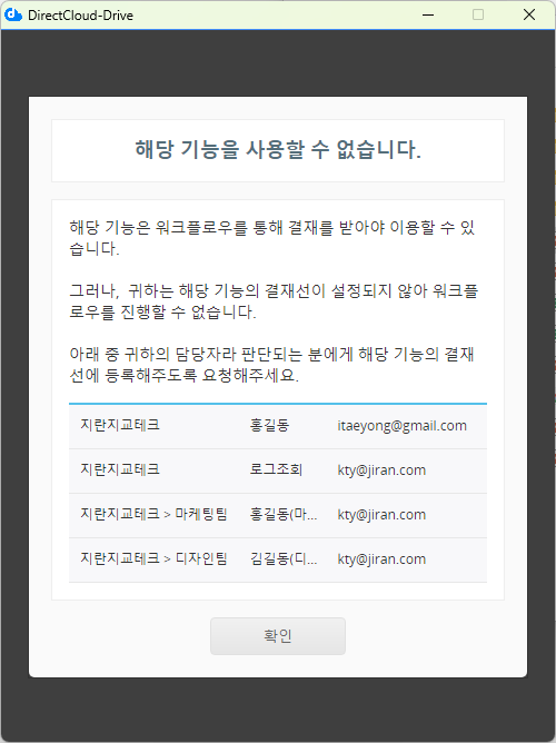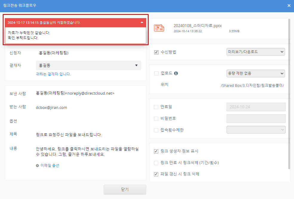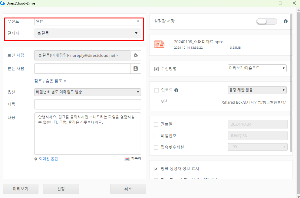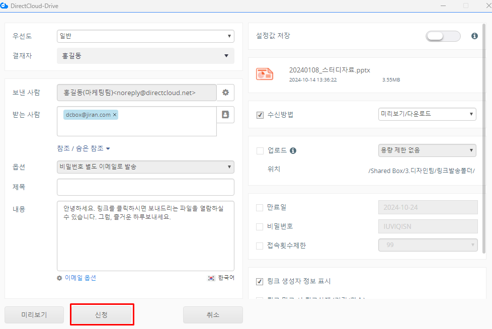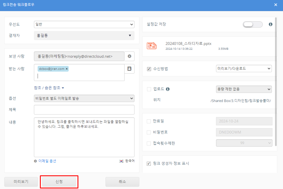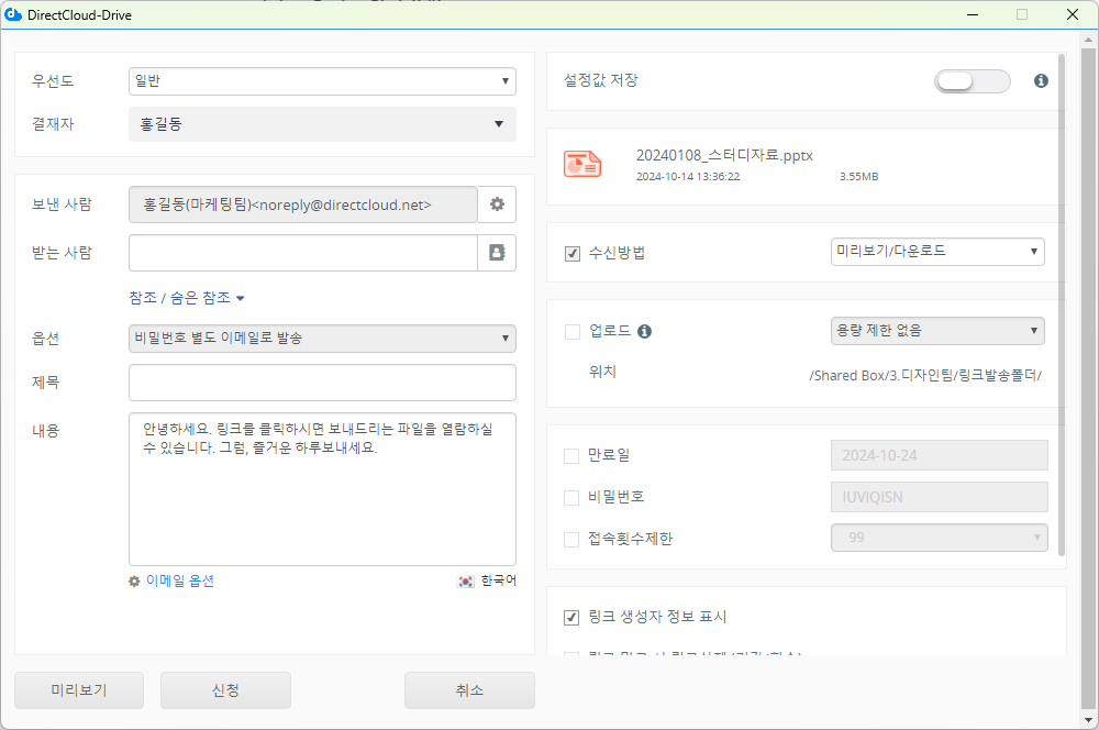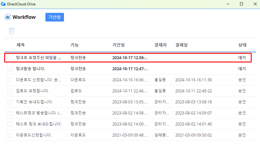 DirectCloud 드라이브에서 링크전송 승인 신청