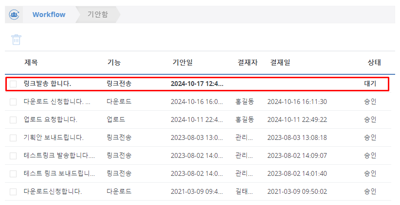 상태가 '대기'인 워크플로우의 신청이 추가했는지 확인합니다.