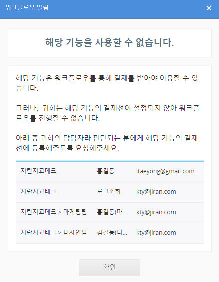 관리 페이지에서 '워크플로우'가 '사용' 으로 활성화되어 있더라도, '공유설정'->' Shared Box 관리' 에서 '워크플로우'가 사용안함’으로 되어 있는 경우, 선택한 폴더에서는 워크플로우를 사용할 수 없습니다.
