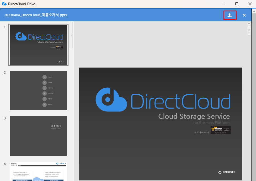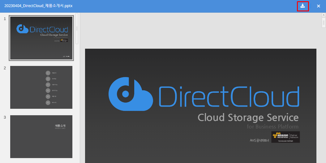 미리보기 화면에 파일이 표시됩니다. 이 화면에서 오른쪽 상단의 다운로드 버튼을 클릭하여 파일을 다운로드할 수도 있습니다.